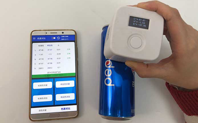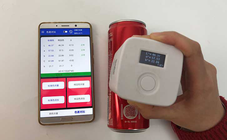 用色差儀對這兩個易拉罐的外觀顏色進(jìn)行檢測后,色差儀連接的App顯示這兩個易拉罐的不同部位都是沒有色差的。可口可樂公司和百事公司的品質(zhì)把控還是不錯的。測量易拉罐這種圓柱形的樣品時,我們應(yīng)該注意要用測量口完全覆蓋住罐體,也就是要用色差儀緊壓在易拉罐表面,防止漏光。這款色差儀采用的是積分球的原理,體積小巧,有顏色測量和色差對比兩個功能。色差儀價格也十分優(yōu)惠,是一款適合顏色測量并且經(jīng)濟(jì)適用的精密顏色測量儀器。