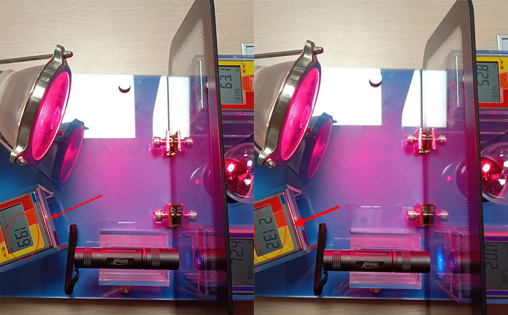 左圖在放入貼膜玻璃后測試反射的儀器測試出的紅外反射光強(qiáng)為199w/m2,基本沒有反射熱量,而且測試完成之后拿下玻璃的時(shí)候玻璃本身的溫度會(huì)比較高,而右圖的貼膜玻璃放入測試槽口后測試出的紅外反射光強(qiáng)為2132w/m2。測試結(jié)束之后玻璃本身溫度并沒有太高。由此來看,右圖的樣品玻璃就是通過反射熱量來隔熱的金屬膜。同時(shí)還可以使用這種測試方法,通過對(duì)比儀器的數(shù)據(jù)來對(duì)比測試不同款金屬膜的反射性能的優(yōu)劣。