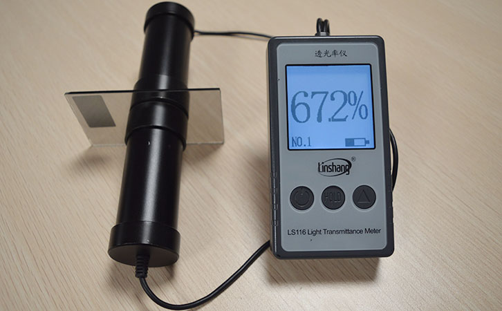 把探頭裝入固定座中,開機(jī)透光率顯示為100%時,把要測試的材料放進(jìn)測試槽口即可,測量數(shù)據(jù)立馬顯示。