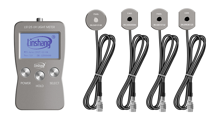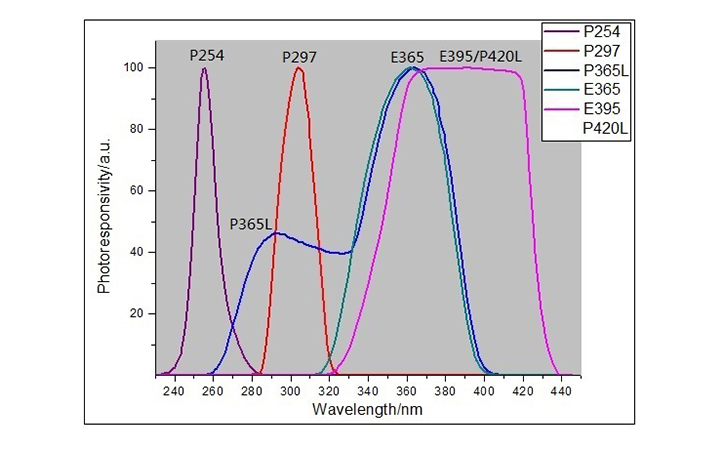 LS125紫外輻射照度計是林上專利產品(專利號:ZL 2017 2 0803922.5),有7款探頭可以選配,其中就有4款是用來測量UVA波段的,分別是P365L、E365、P420L和E395。以下跟大家說說這四款探頭最大的特點: